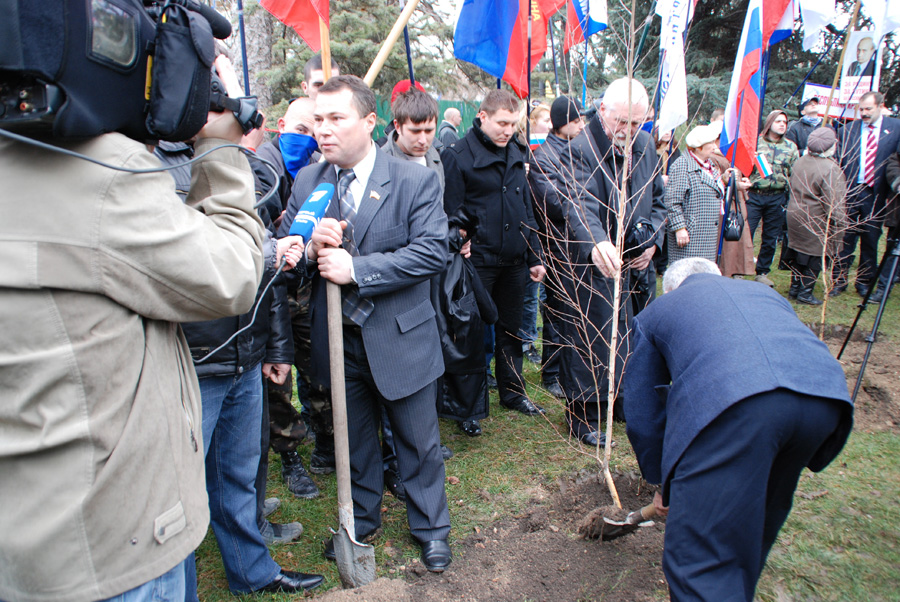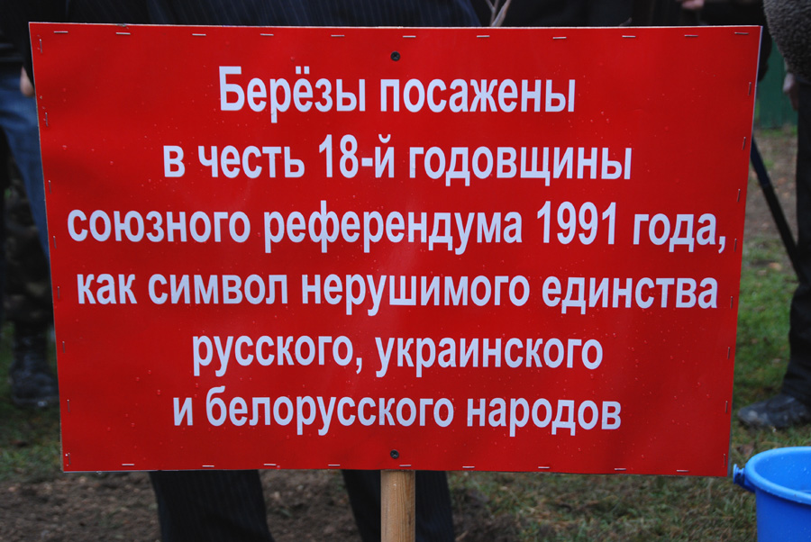 Идёт посадка трёх берёз в честь 18-й годовщины Всесоюзного референдума 1991 года, как символ нерушимого единства русского, украинского и белорусского народов. |